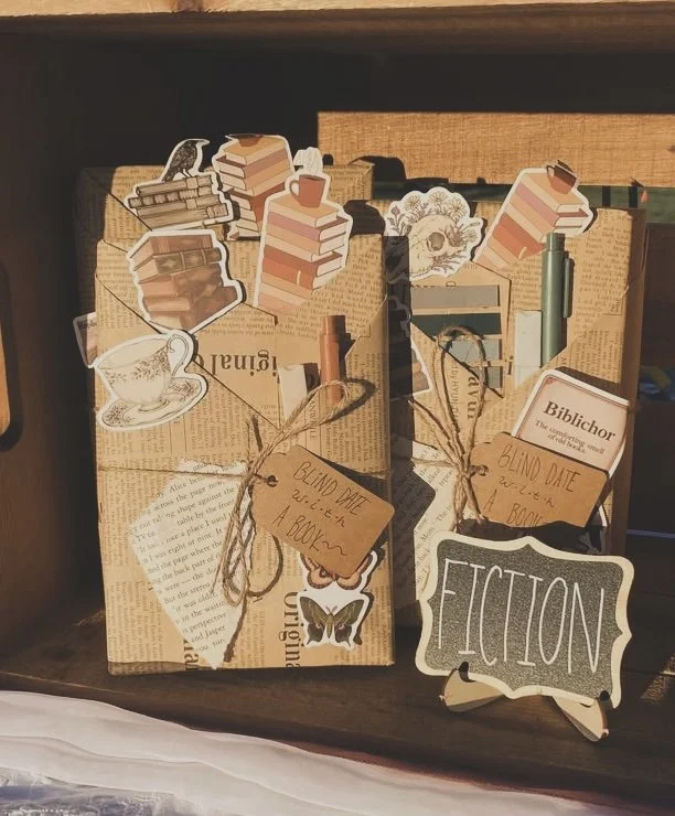 each blind date is carefully hand-wrapped with love and includes a surprise fiction novel (new or gently loved), wrapped in paper and tied with twine. you’ll find a few thoughtful hints on the front—just enough to spark your interest, but never enough to spoil the story waiting to unfold.
