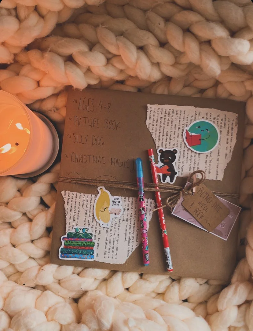 each blind date is joyfully hand-wrapped with care and includes a surprise children’s book (new or gently loved), wrapped in paper and tied with twine. on the front, you’ll find a few playful hints—just enough to make little readers curious, but never enough to spoil the surprise inside.